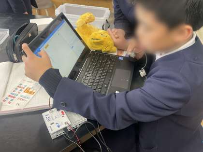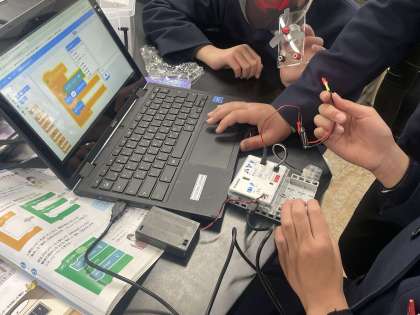 電気は、光・音・熱・運動などに変えて利用されていることをこの単元で学びます。その電気を無駄なく必要な時だけ利用することが大切です。そこで電気をセンサーで制御するプログラムを作りました。明るさセンサーや人感センサーにプログラムして、自分たちが思うように電気を光らせたり、消したりさせました。