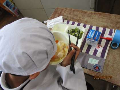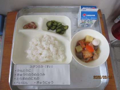 今日の給食は、ごはん、牛乳、関東煮、きゅうりの梅風味、とら豆の煮ものです。
