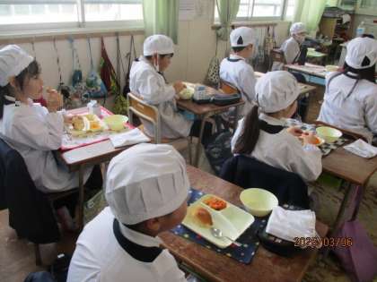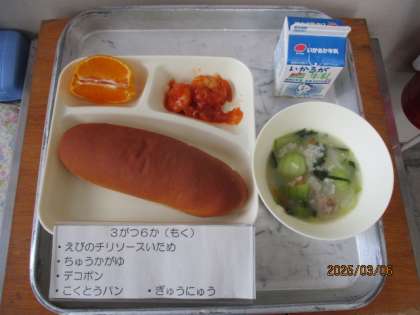 今日の給食は、黒糖パン、牛乳、えびのチリソースいため、中華がゆ、デコポンです。