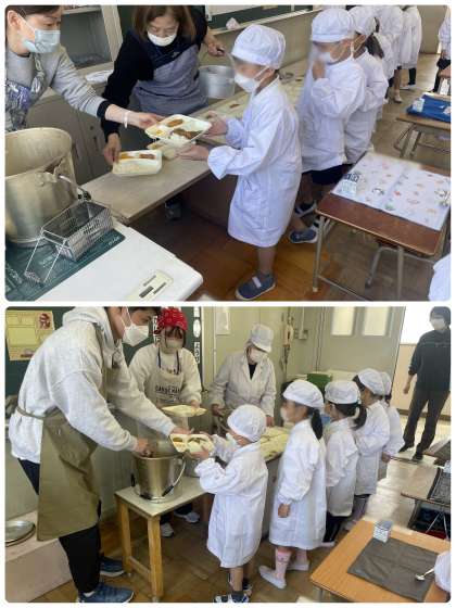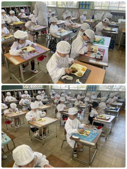 白衣の着方や配膳の方法など学びながら、準備をすすめました。6年生が配缶を手伝ってくれています。少しずつ自分たちでできるように、ゆっくりと学んでほしいと思います。
