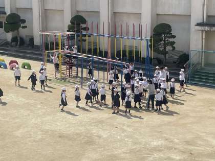 休み時間に、初めて運動場に出て過ごしました。遊具の使い方など、運動場でのきまりも学びました。暖かい日差しの中、元気に駆け回る姿が見られました。