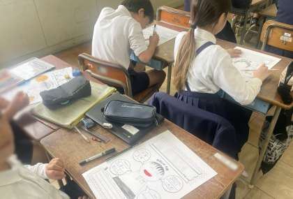 お互いを知り合い、共感し合えたら、なかよくなれます。自分自身をなかなかお話して伝えられないことも、ポスターなら伝えられることもあります。「サッカーのゴールキーパーをやっている。」「ダンスをやっている。」、好きな食べ物は、「きゅうり」「かぼちゃのういろう」「野菜いため」。「へえー、そうなんやあ。」って、書きながら会話が弾んでいきました。