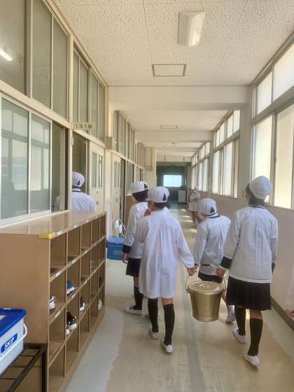 新年度の給食が始まりました!!入学したピカピカの1年生のみなさんをお祝いする献立です。給食を運ぶのは、新6年生のお兄さんお姉さん達です。背中が頼もしいです。
