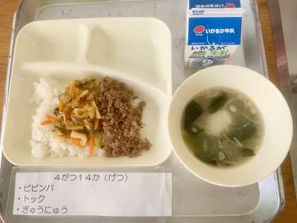 本日は、韓国朝鮮の料理献立です。いろんな国のお料理が食べられるのも、給食の良さです!ビビンバは、スプーンで混ぜていただきます。トックは、お餅のことです。薄く切ったもちっと食感のトックに、たまねぎ、こまつな、えのきたけが入ったスープです。児童に大変、人気の献立です!初めての1年生もニコニコ笑顔で食べていました。