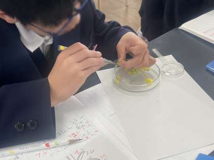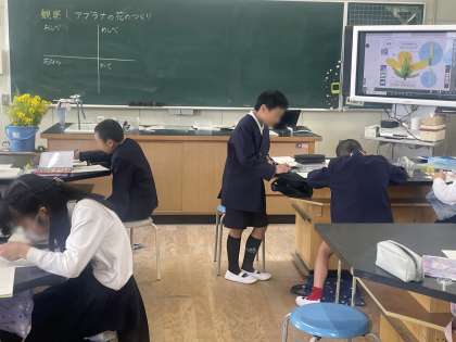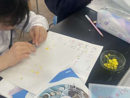 アブラナの花のつくりを調べました。おしべやめしべ、花びらの数や形をピンセットや虫眼鏡を使って観察しました。みんな、細かくていねいな作業を集中して興味深く取り組んでいました。