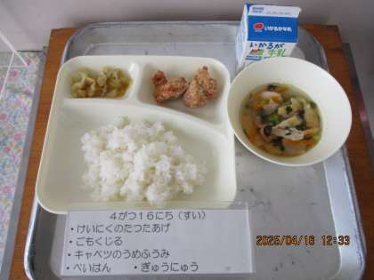 本日は、鶏肉の竜田揚げです。給食では、しょうが汁、料理酒、こいくちしょうゆで下味をつけ、つけ汁を切り、片栗粉をまぶして、熱したなたね油で揚げます。下味がしっかりしみ込んで、カリカリサクサクじゅわっと美味しいです。みんな大喜びでした!!