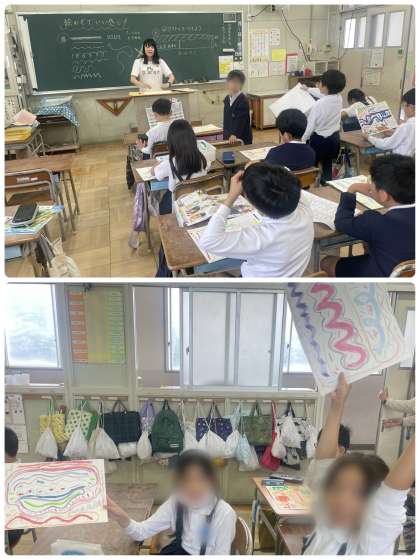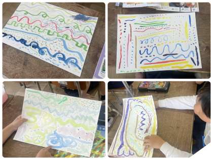 絵の具で思い思いに色を作って、いろいろな線や点を描きました。できあがった作品にどんな作品名をつけようか、想像が膨らんでいました。