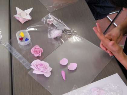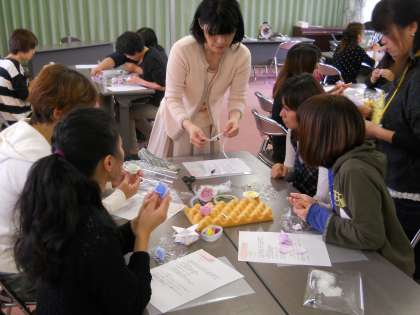 PTA成人委員会が主催する手芸講習会が行われました。約20名の参加者が講師先生の指導のもと、コサージュ作りに取り組みました。手のひらに乗せたねん土を丁寧に押し広げ、花びらを一枚一枚作っていきます。