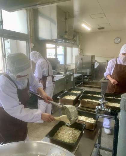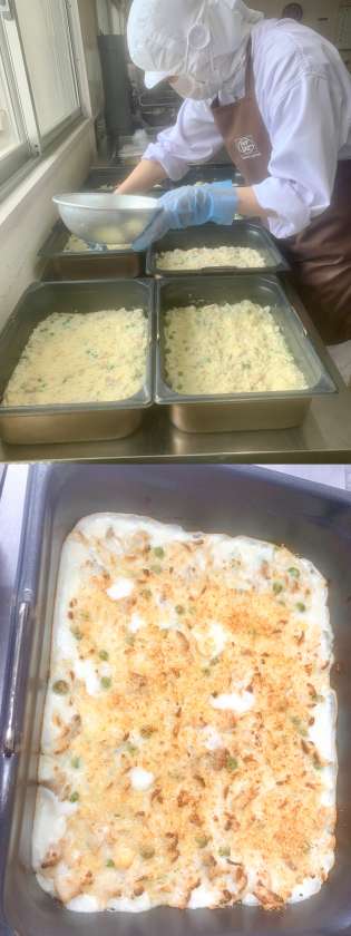 本日は、マカロニグラタンです。大きな釜で調理して、クラスの人数分ミニバットに入れて、粉末チーズ、パン粉をかけて、焼き物機で焼いたら、こんがり黄金色に輝くグラタンのできあがりです。焼き物機からだすと、チーズの焦げるいい匂いが給食室にひろがっていました。「グラタン好き!」「美味しかった!」とみんな美味しい笑顔で教えてくれました。