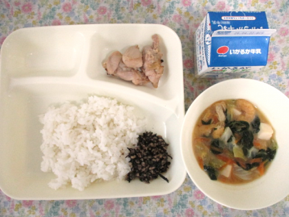 ・鶏肉の甘辛焼き・みそ汁・魚ひじきそぼろ・ごはん・牛乳