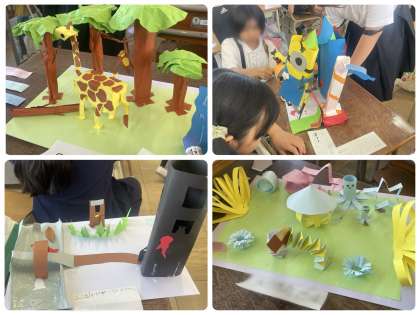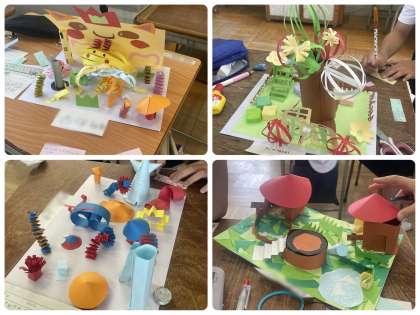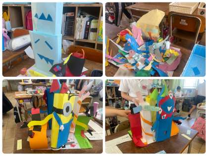 自分が思い浮かぶあこがれの町を作り上げました。空想や現実の世界をイメージしながら形にしていきました。「マイタウン」で一人一人どのように過ごしているのでしょうか?できあがった作品をみんなで鑑賞し、すてきなところを伝え合いました。