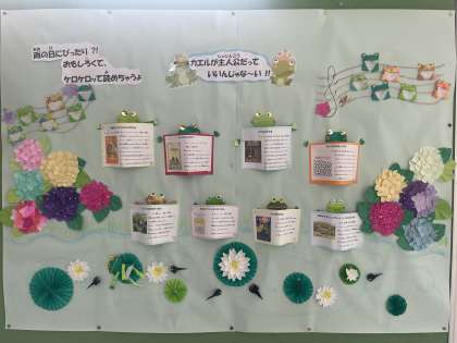 梅雨の季節となりました。外で遊べない日は、読書をして、安全に落ち着いて過ごしてほしいと願います。図書室の前には、かえるさんが主人公の本がたくさん紹介されています。