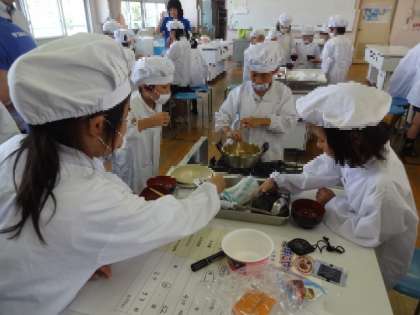 班で考えて、袋めんを使ったりカップめんを使ったりして、環境学習に取り組んでいました。