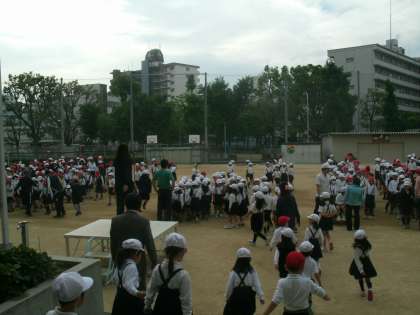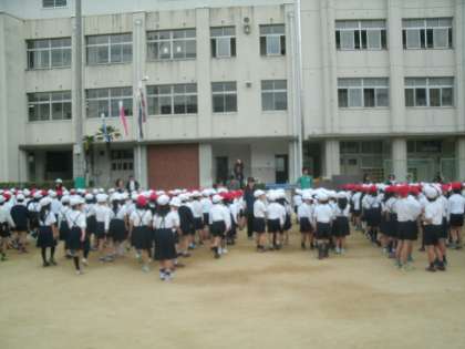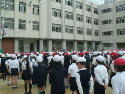 今年度はじめて、運動場で児童朝会がおこなわれました。