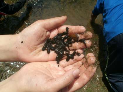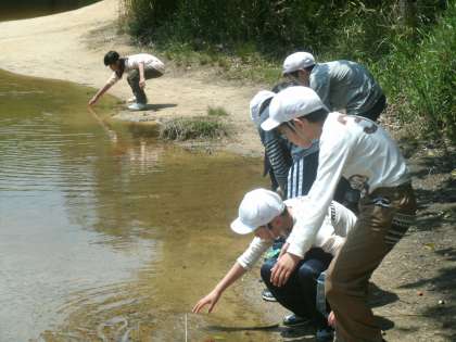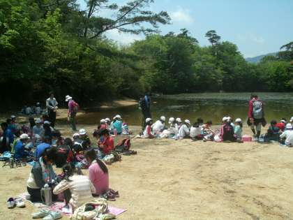 登山の後は、池(横池)のほとりでランチタイムです。みんなおいしそうに食べていました。食べ終わるとさっそく自然観察です。池にはオタマジャクシが手ですくえるほどたくさんいました。今日はとても充実した一日でした。