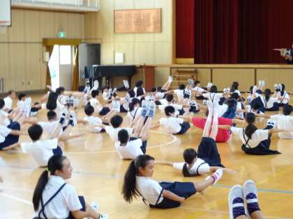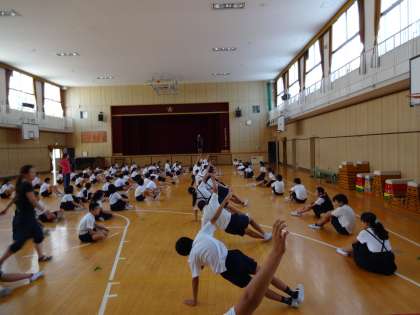 今日は講堂で、「片手バランス」「V字倒立」「ブリッジ」「肩倒立」の練習をしました。