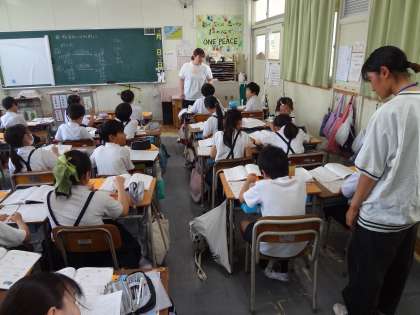 本校では、大学生がボランティアとして、授業の合間にサポートに来ています。大学生に優しいお姉さんに子どもたちはうれしいようです。