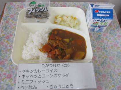本日は、チキンカレーライスです。鶏肉、じゃがいも、たまねぎ、にんじん、グリンピース、にんにくが入っています。カレールウの素は、米粉のカレールウを使用しています。小麦アレルギーの児童も安心して、食べることができます。