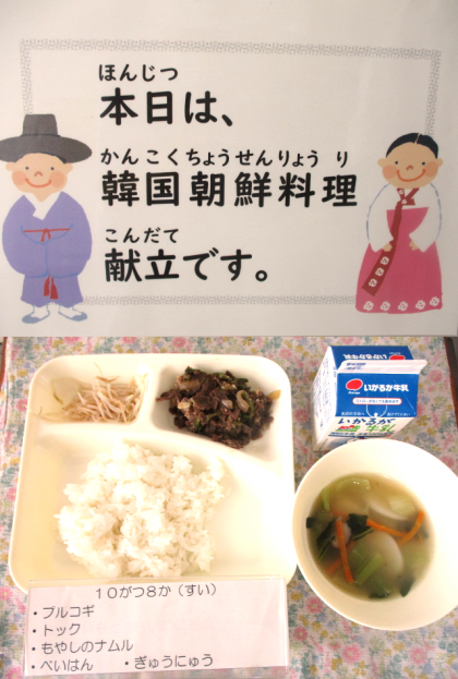 本日は、韓国朝鮮の料理、プルコギとトックが登場しました。プルコギのプルは「火」、コギは「肉」という意味で合わせて、火で焼いた肉という意味になります。トックのトッは、「もち」、クッは「汁」という意味でもちと野菜を使ったスープです。薄くスライスされたトックは、もちもちで美味しかったです!