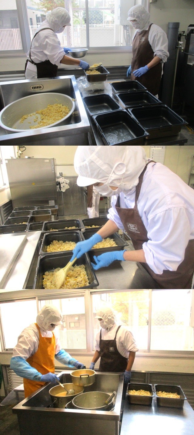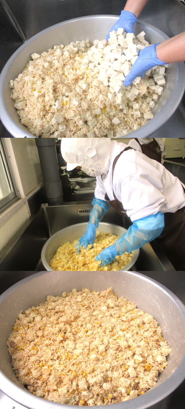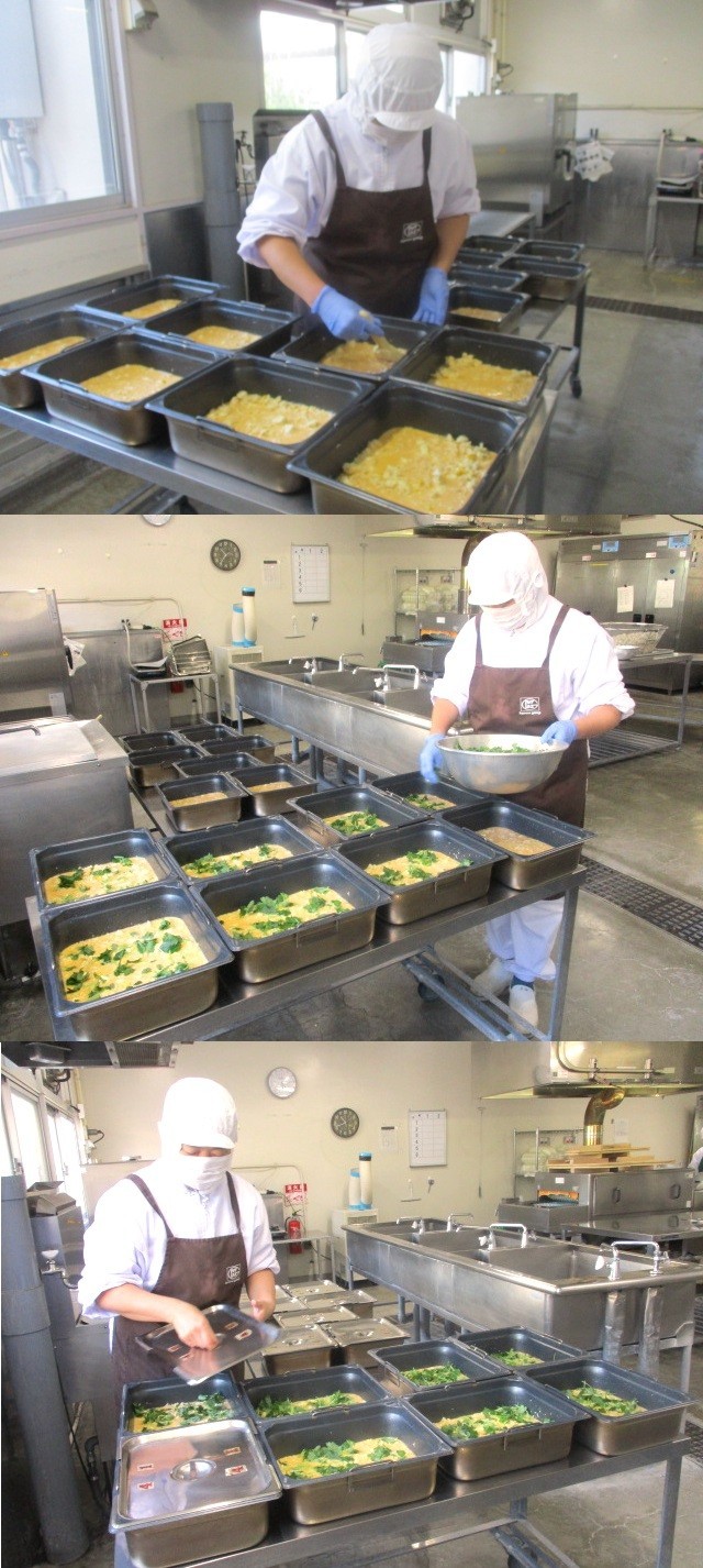 本日は、卵の千草焼きです。ささみ、とうふ、コーンを混ぜ合わせ、砂糖、塩、うすくちしょうゆで味つけし、よく混ぜます。綿実油をひいたミニバットに1クラスごとの分量を入れ、表面をへらでならします。次に、けずりぶしでとっただしと液卵を入れ、表面をへらでならし、みつばをちらし、ふたをします。ミニバットは全部で16個!!1つ1つ調理員さんが丁寧な手作業で仕上げていきます。