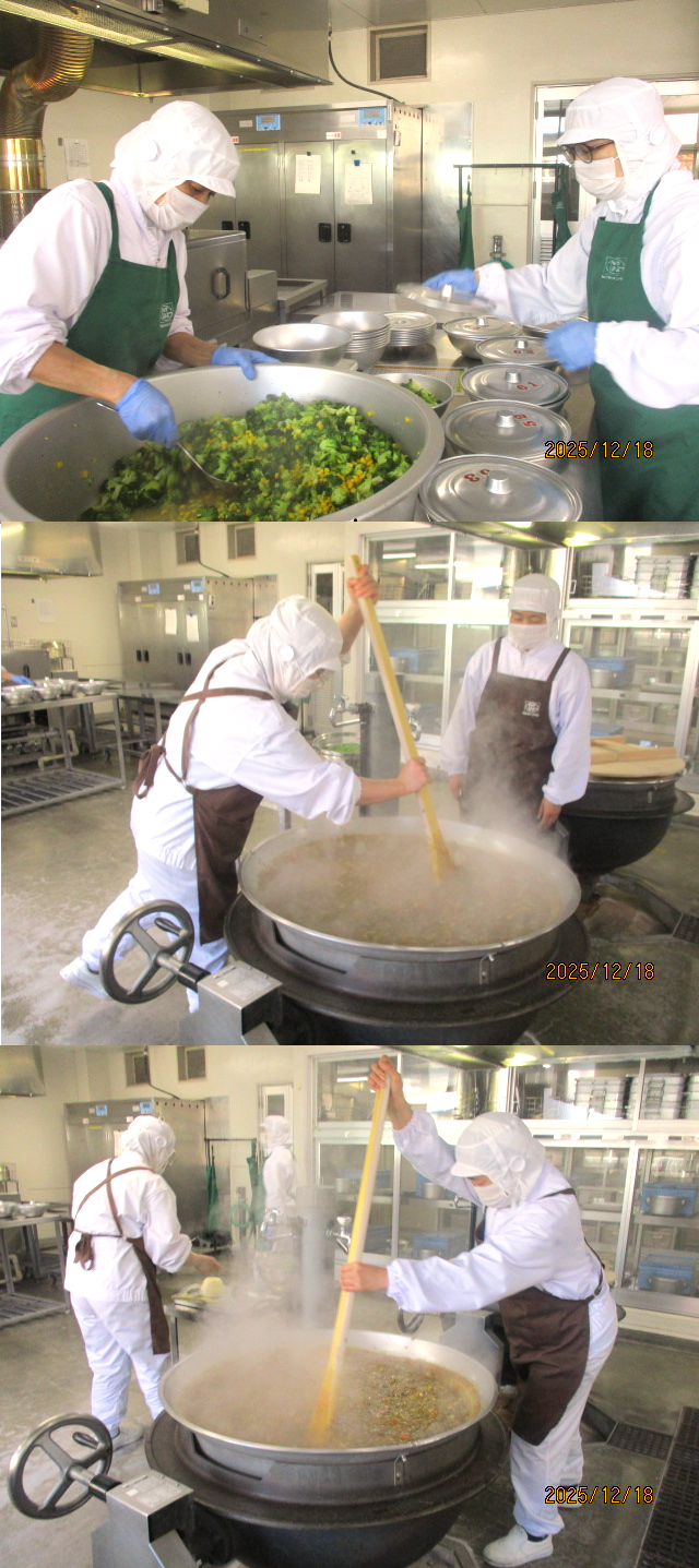 朝の給食室では、調理員さんが、ラッキーにんじんをたくさん作ってくださっていました。月と星の形です。そして、カレーは、煮こむ時間が大事なので、2人体制で交代しながら混ぜてくださっていました。おかげで絶品カレーができあがりました!調理員さんに感謝です。