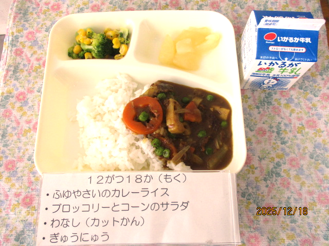 本日は、冬野菜たくさん献立です。大阪市のカレーの献立でも大人気メニューの冬野菜カレーは、牛肉、たまねぎ、にんじん、グリンピース、しょうが、にんにく、冬野菜のだいこん、れんこんが入っています。夏には、夏野菜カレーもあります。もう一つが冬野菜のブロッコリーをつかったブロッコリーとコーンのサラダです。