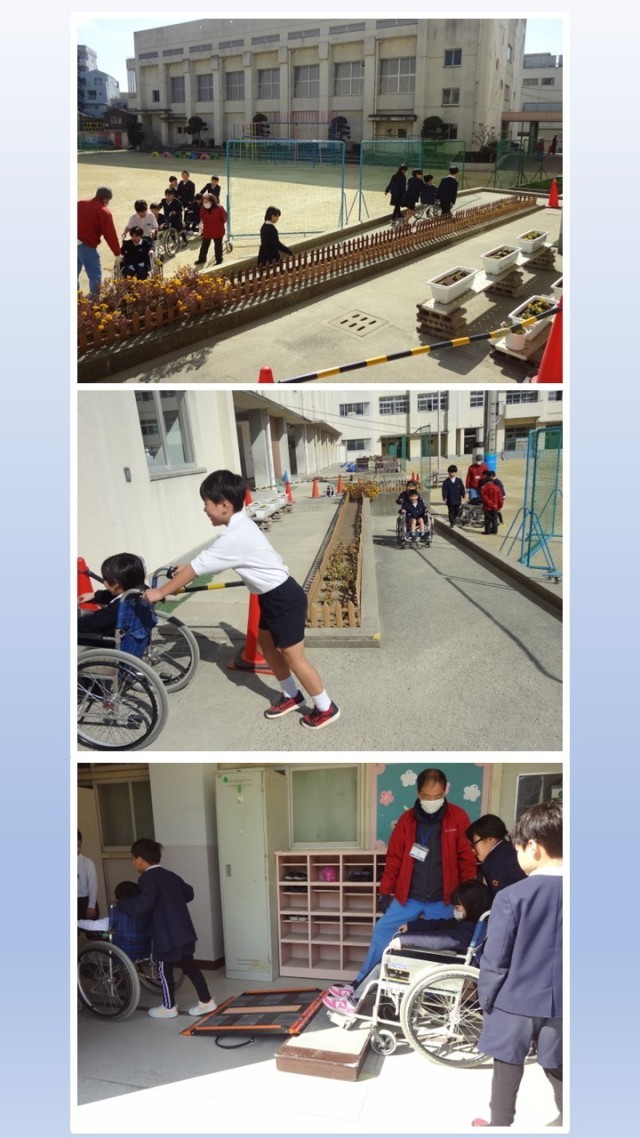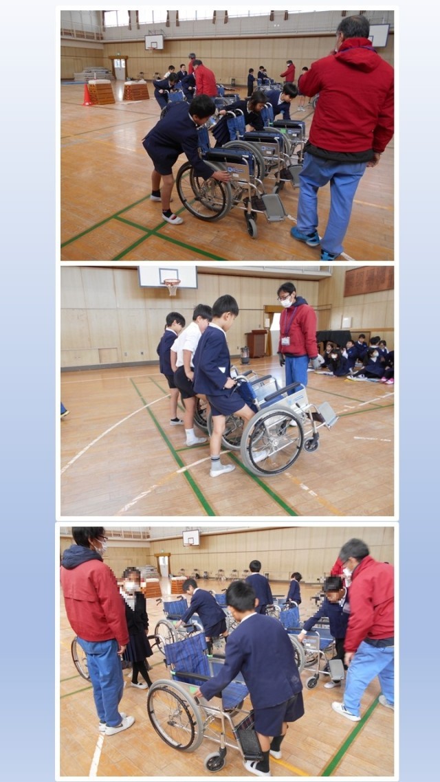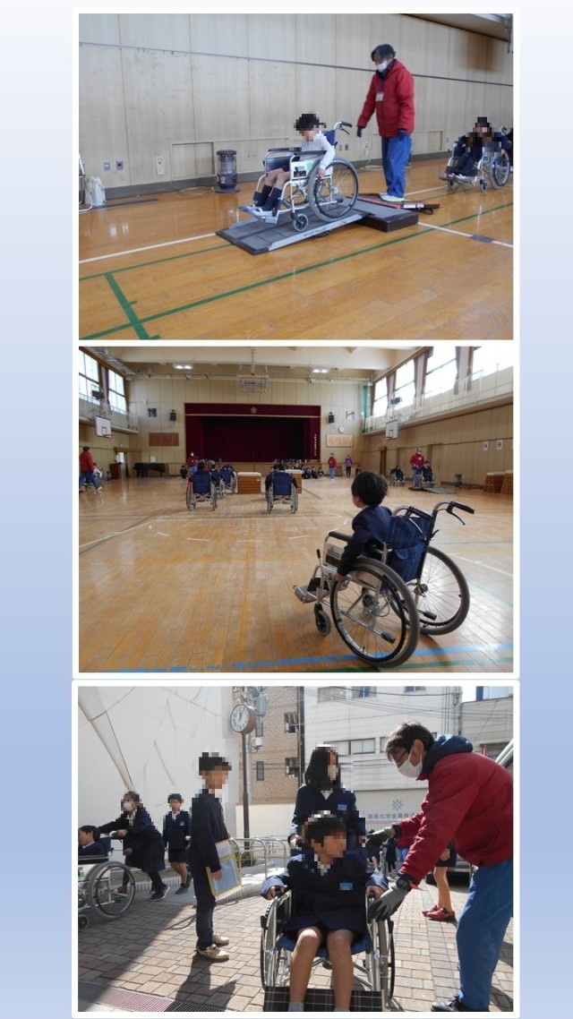 平野区にある大阪市立心身障がい者リハビリセンターの方々に来校いただき、3年生が「車いす体験」の学習に取り組みました。車いすの操作方法の説明を聞きました。そのあと、講堂や校舎周辺を実際に車いすに乗ったり、車いすの介助を行ったりしました。活動する中で、障がいのある方の立場を感じ、また心を寄せることができたようです。