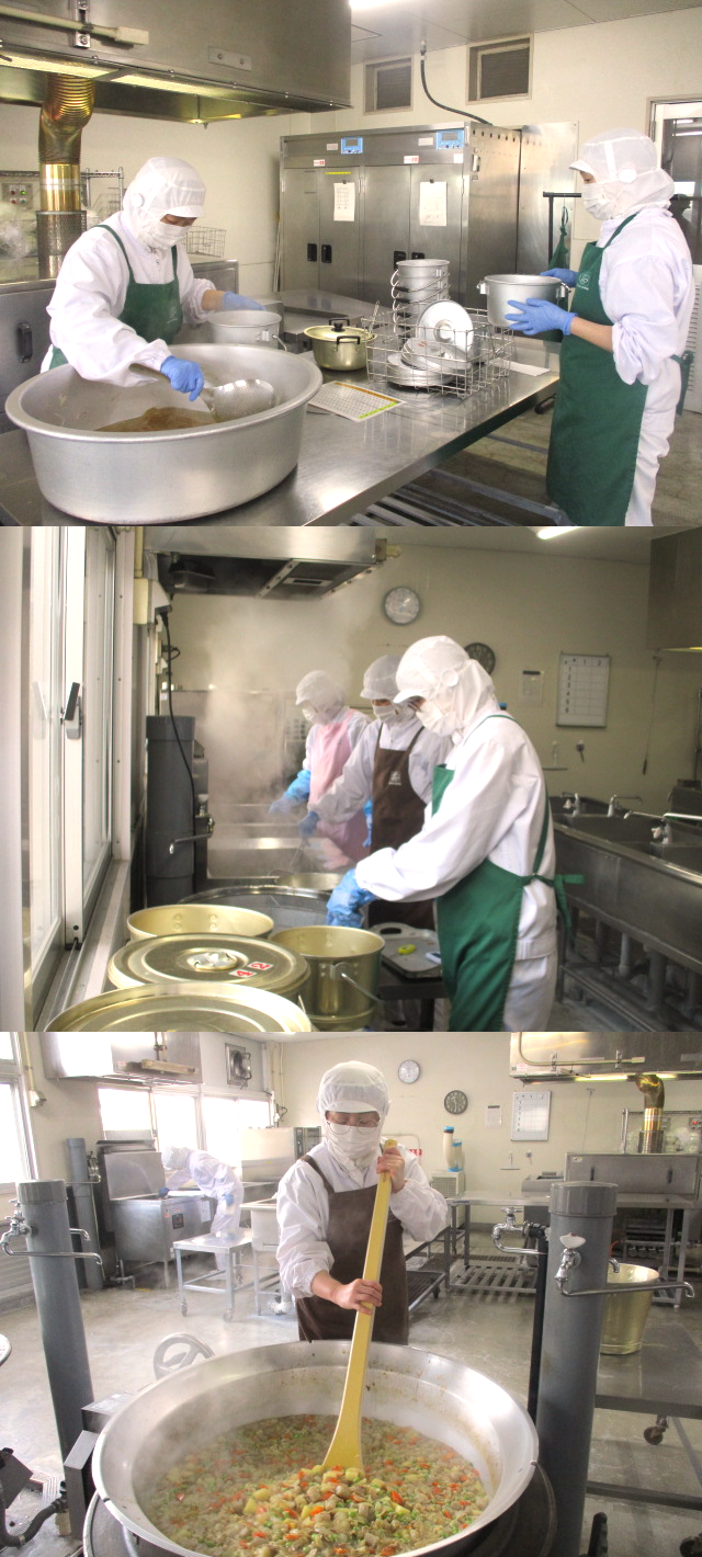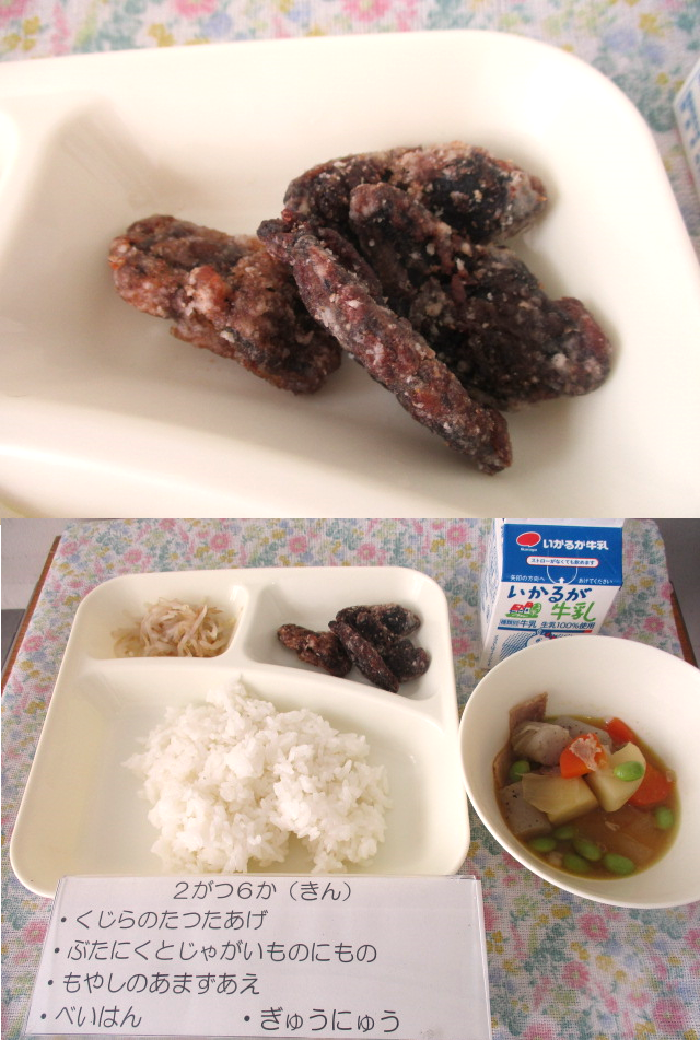 くじらのたつたあげは、冷凍のまま170度に熱したなたね油でじゅうぶんに揚げます。しっかり味つけされていて、しょうがも使っているので臭みもなく、サックリサクサクやわらかく食べやすくなっています。こども達も大喜びで、「美味しかった!!」「おかわりしたよ!」と教えてくれました。