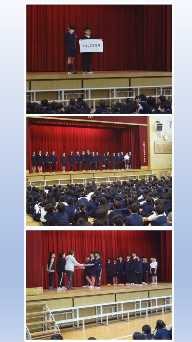 今日の児童集会は、最初に代表員会から「ユニセフ募金」についての報告とお礼がありました。