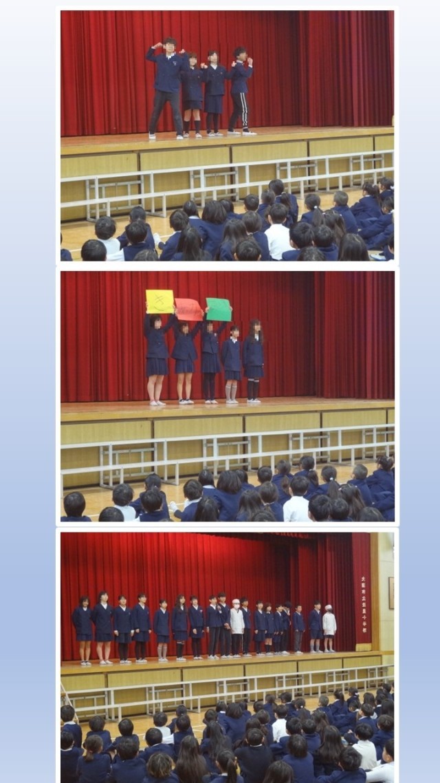 次に、給食委員会による発表がありました。毎日おいしい給食を作ってくださっている調理員さんへ感謝の気持ちを伝えるとともに、私たちが「安心・安全」に給食を食べるための大切なルールについて、全校児童で再確認しました。