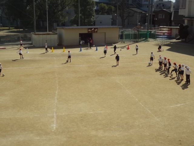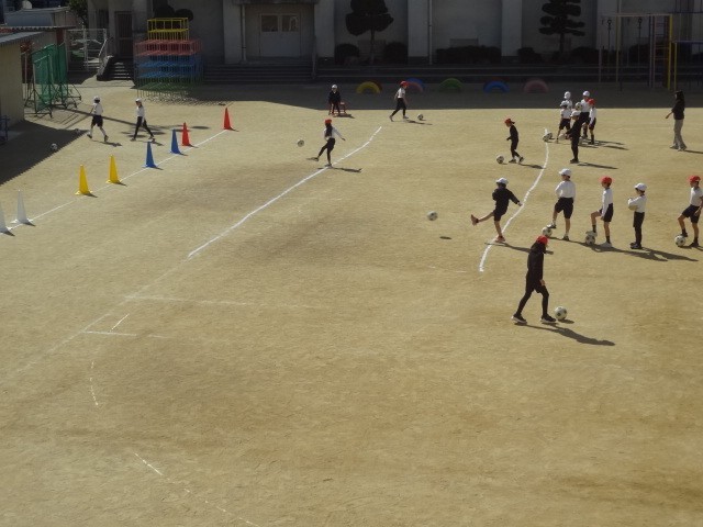 ラインサッカーのゲームの前に、「ボールを蹴る」など、基本的なスキルを練習しています。自分が思うようにボールを蹴ったり止めたり、パスしたりドリブルしたりできるように今は練習中です。