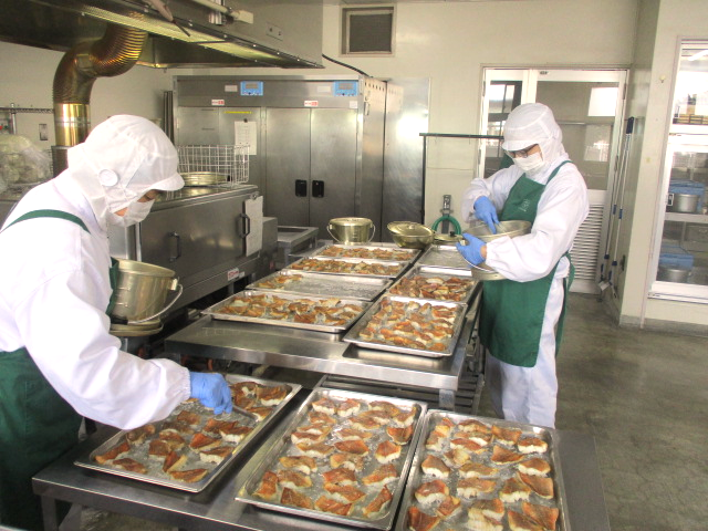 あかうおのレモンじょうゆかけは、あかうおを焼き物機で焼きます。みりん、うすくちしょうゆ、湯を合わせて煮立て、最後にレモン汁を加えて煮、焼きあがったあかうおにかけたらできあがりです。本日は、国産のレモンを調理員さんが、絞り器で絞ってくださったものを使用しています。爽やかなレモンの香りが、後味さっぱりにしてくれます。