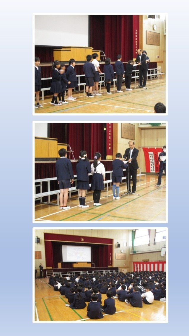 全児童が集まる日が最後となる児童朝会でした。はじめに、「読書感想画コンクール」の表彰と、「姫里小タイピング大会」の表彰を行いました。がんばった成果を表彰という形で認められることは、子どもたちの様々なことに対する意欲の向上につながります。