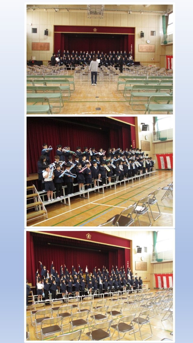 昨日から1年生が講堂で入学式の練習を始めています。入学式では、毎年、新2年生が新1年生を歓迎する演技を行っています。呼びかけでは、学校の毎日の様子や運動会などの行事を紹介します。そのほかにも、鍵盤ハーモニカの演奏をしたり音楽の学習で習った歌を振り付きで歌ったりしていました。先生の合図に合わせて、しっかりとセリフを言う姿に、子どもたちの1年間の成長を感じました。