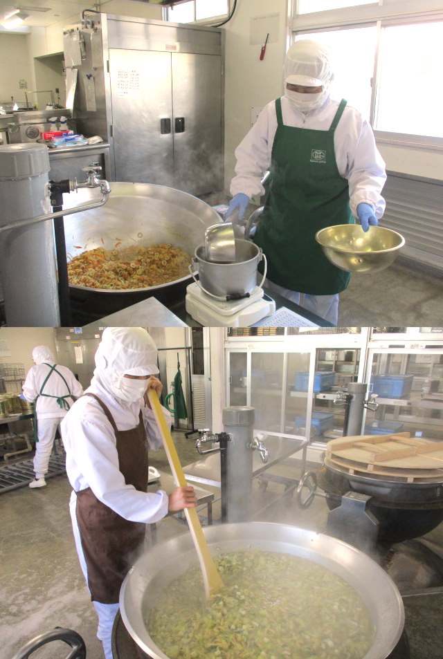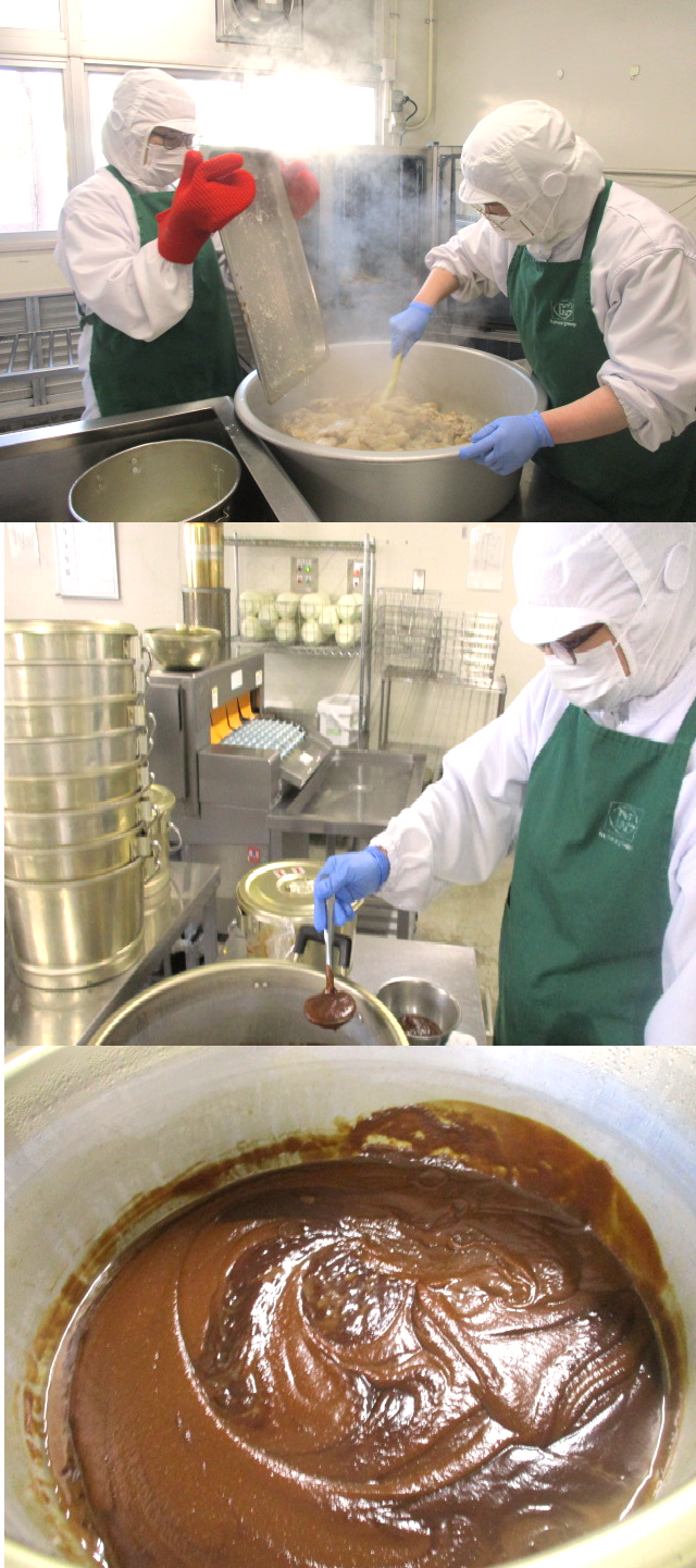 鶏肉は、料理酒で下味をつけます。鶏肉は、焼き物機で焼きます。砂糖、みりん、八丁みそ、赤みそに湯を少しずつ加えて煮立て、水どき片栗粉でとろみをつけ、配缶時に鶏肉にかけます。八丁みそのコクがジューシーに焼きあがった鶏肉によくあいます。今日は、八丁みそのお話しをしました。