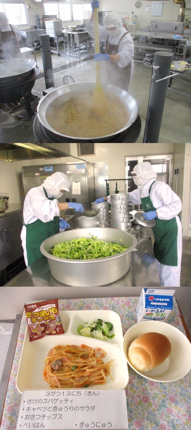 さけのスパゲッティは、給食室3台の釜フル稼働で作ります。2釜でルウを作り、1釜で麺をゆでます。紅ざけフレーク、ベーコン、スパゲッティ、たまねぎ、にんじん、グリンピース、マッシュルームが入っています。できあがると、さけのピンク色とグリンピースの黄緑が浮かびあがって春らしい献立です。