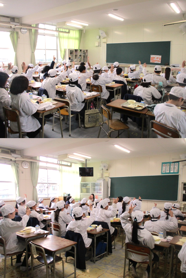 来年度、高学年になる5年生と6年生の教室に行きました。「かっこよかった6年生みたいに、みんなの見本になるようなかっこいい5年生、6年生になれますか?」と聞いた後の様子です。来年度のこども達の成長が楽しみになりました。来年度も、給食をいい姿勢で美味しく楽しく残さずに食べて大きくなあれ☆ガンバレガンバレ☆