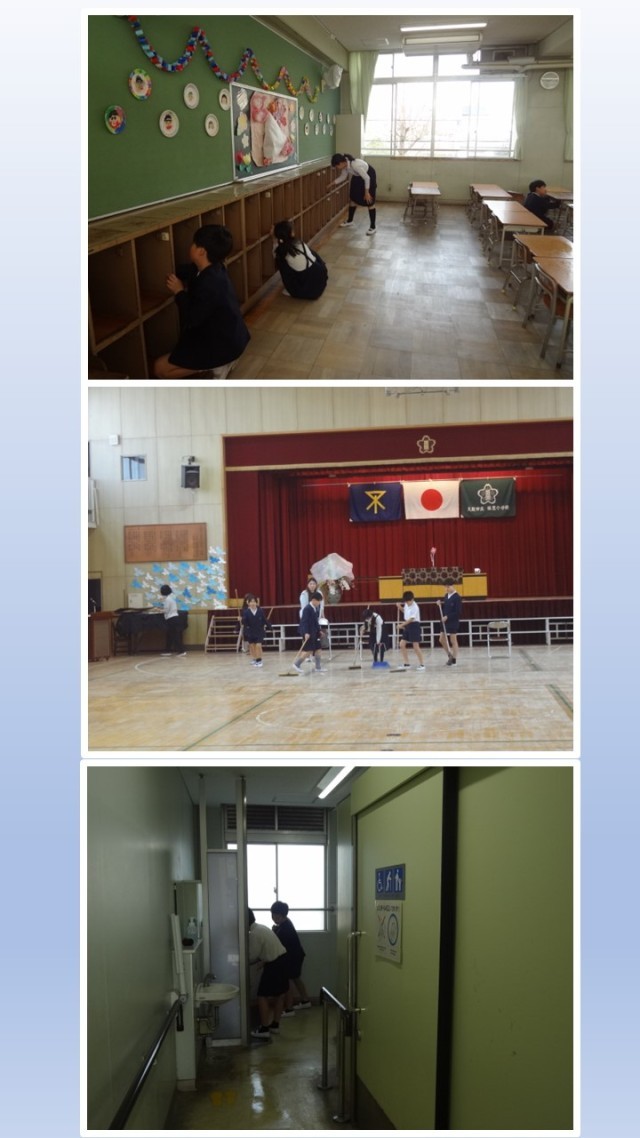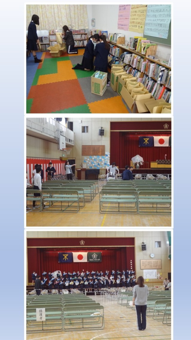 明日の入学式のために新6年生がどんどん準備していきました。そのあと、新2年生が歓迎の演技の練習に一生懸命取り組んでいました。新1年生を迎える準備は万端です。待ってますよ。