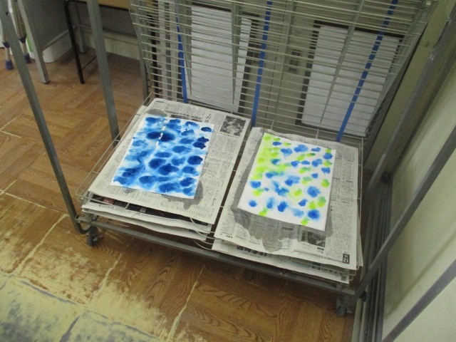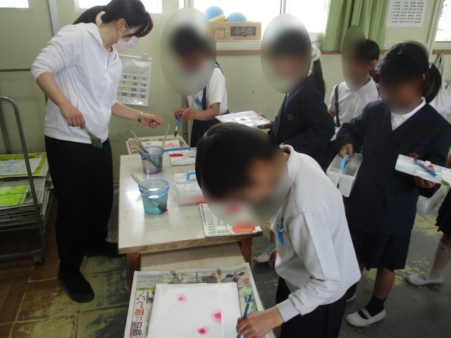 4年生になって初めての絵の具を使った活動です。水で濡らした画用紙に、色水を垂らして模様を作ります。自分で選んだ2色の絵の具の色の混ざり具合や出来上がった模様を楽しみました。