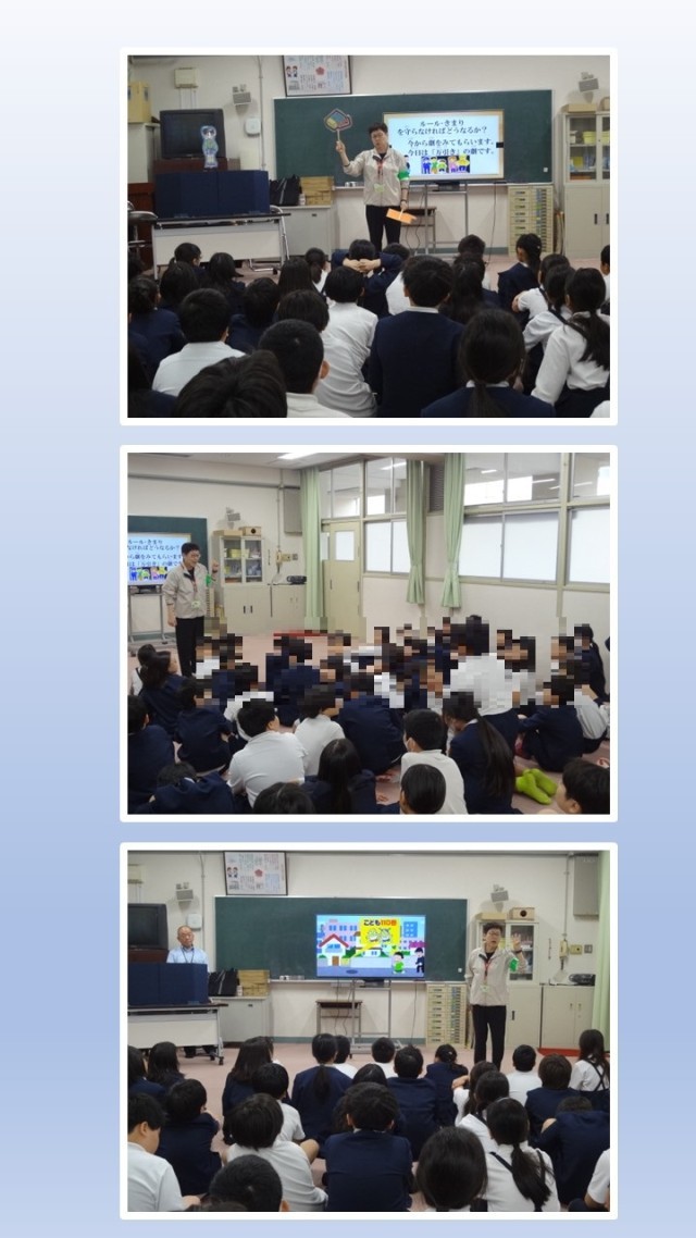 大阪府梅田少年サポートセンターより職員2名の方に来ていただきました。非行とは何か、社会のルールを守ることの大切さ、スマホのトラブルについて学びました。ルールを守ること・断る勇気をもつこと・思いやりの気持ちの大切さ。この3つを忘れないでほしいと思います。