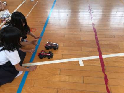 モーターカーを使って、直列つなぎと並列つなぎのモーターの回る速さが違いを調べました。