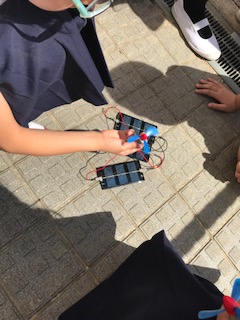 光電池に日光に当てると電気が流れることを知り、たくさんの電流を流そうとして回路を工夫するグループもいました。 -