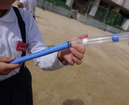 空気や水の性質を学習したあと、昨日は4年1組、今日は2組の児童が、空気てっぽうの飛ぶ仕組みを知るために実験をしました。