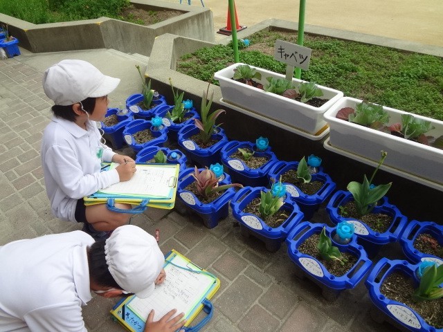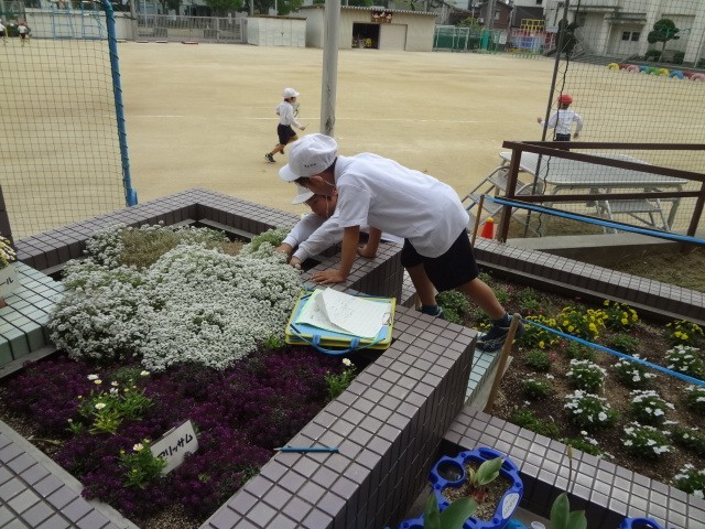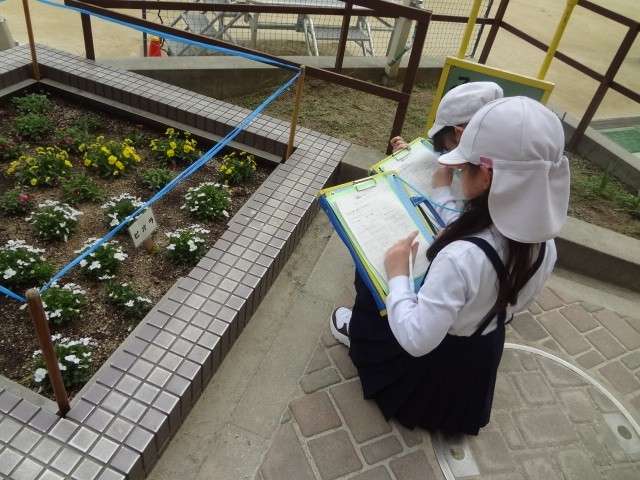 春の植物や昆虫を校庭で観察しました。見つけたものや気づいたことをワークシートに記録しながら、友だちとつぶやき合っていました。疑問に思ったことや、この後どうなっていくのかなど、問題を見いだし解決していきます。