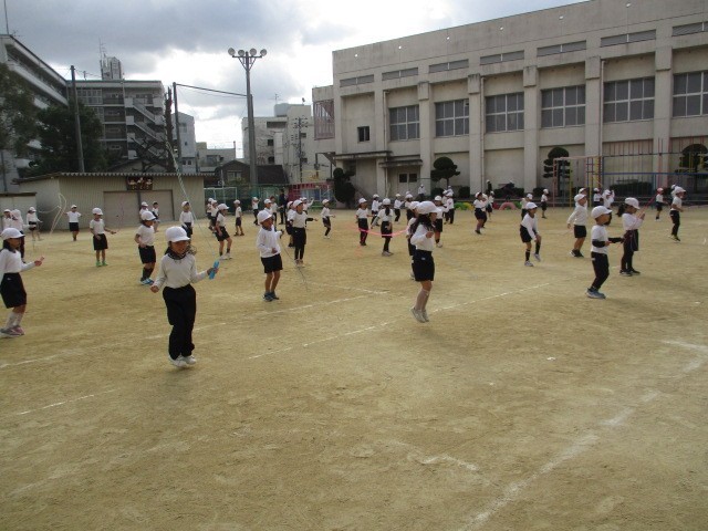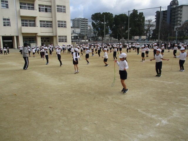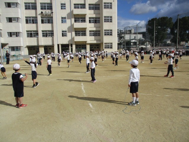 11月26日から始まった20分休みのなわとび練習、最終日の今日は1・2年生が練習しました。準備運動から始まり、前跳び、片足跳び、かけ足跳び、後ろ跳び、あや跳び、交差跳び、二重跳び、など一通り練習したあと、苦手な跳び方をそれぞれ練習していました。どんどん跳べるようになっています。20分休みのなわとび練習は今日までですが、あと1週間、休み時間や体育の時間に練習します。