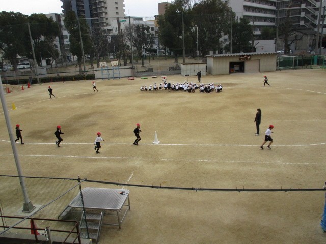 夏休みが終えてから、毎日暑い日が続き、体育の学習はずっと講堂で行われていました。今日は朝から、秋を感じさせるさわやかな風が吹き、ひさしぶりの運動場での体育でした。準備体操をしっかりしたあと、運動場を元気に駆け回る子どもたちの姿がありました。