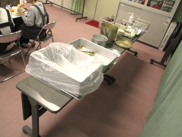本日は、にぼしだしを使ったさつまいものみそ汁とに菊菜(春菊)と白菜のごまあえです。朝の調理室に行くと、3回洗ってピカピカになった大阪、泉州産のきくなと徳島県産のさつまいもが光っていました。