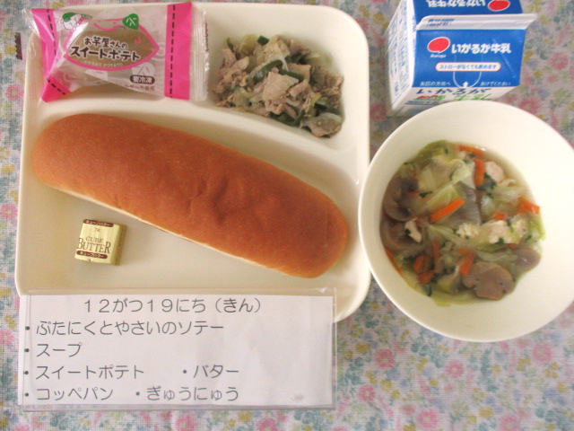 本日は、スイートポテトです。卵も乳も使っていないので、アレルギーの児童も安心して食べることができます。食べるとみんな笑顔になっていました。12月22日(日)は冬至になります。昼が最も短く、夜が最も長い日です。冬至に健康を願ってゆず湯に入ったり、運がつくように、んが2個つく食べ物を食べるなど伝統的な風習があります。金曜日は、放送の日なので、冬至のお話しとスイートポテトのクイズをしました。