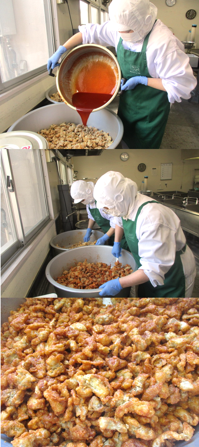 くじらのたつたあげは、冷凍のまま170度に熱したなたね油でじゅうぶんに揚げます。しっかり味つけされていて、しょうがも使っているので臭みもなく、サックリサクサクやわらかく食べやすくなっています。こども達も大喜びで、「美味しかった!!」「おかわりしたよ!」と教えてくれました。