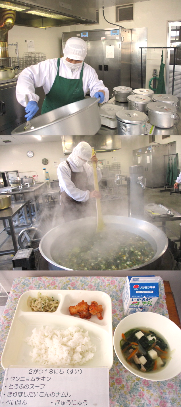 本日も、おせちの献立くりきんとんにかす汁です。鶏肉の塩こうじ焼きは、お肉が柔らかくなっていました。かす汁は、だしこんぶ、けずりぶしでだしをとり、豚肉、にんじん、だいこん、ゆでたつきこんにゃく、熱湯をかけ油ぬきしたうすあげの順に加えて煮ます。煮あがれば、酒かす、うすくちしょうゆ、白みそ、赤みそで味つけし、最後に青ねぎを加えて煮ます。今日も寒かったので、身体がぽかぽかあたたまりました。HKI姫里給食委員会による給食週間記念放送3日目です。今日は、「魚派?肉派?」と「給食に出てくる好きな果物は?」のアンケート結果を発表しました。集会で発表予定でしたが、学級休業や欠席児童が多いため2月12日(木)に延期になりました。